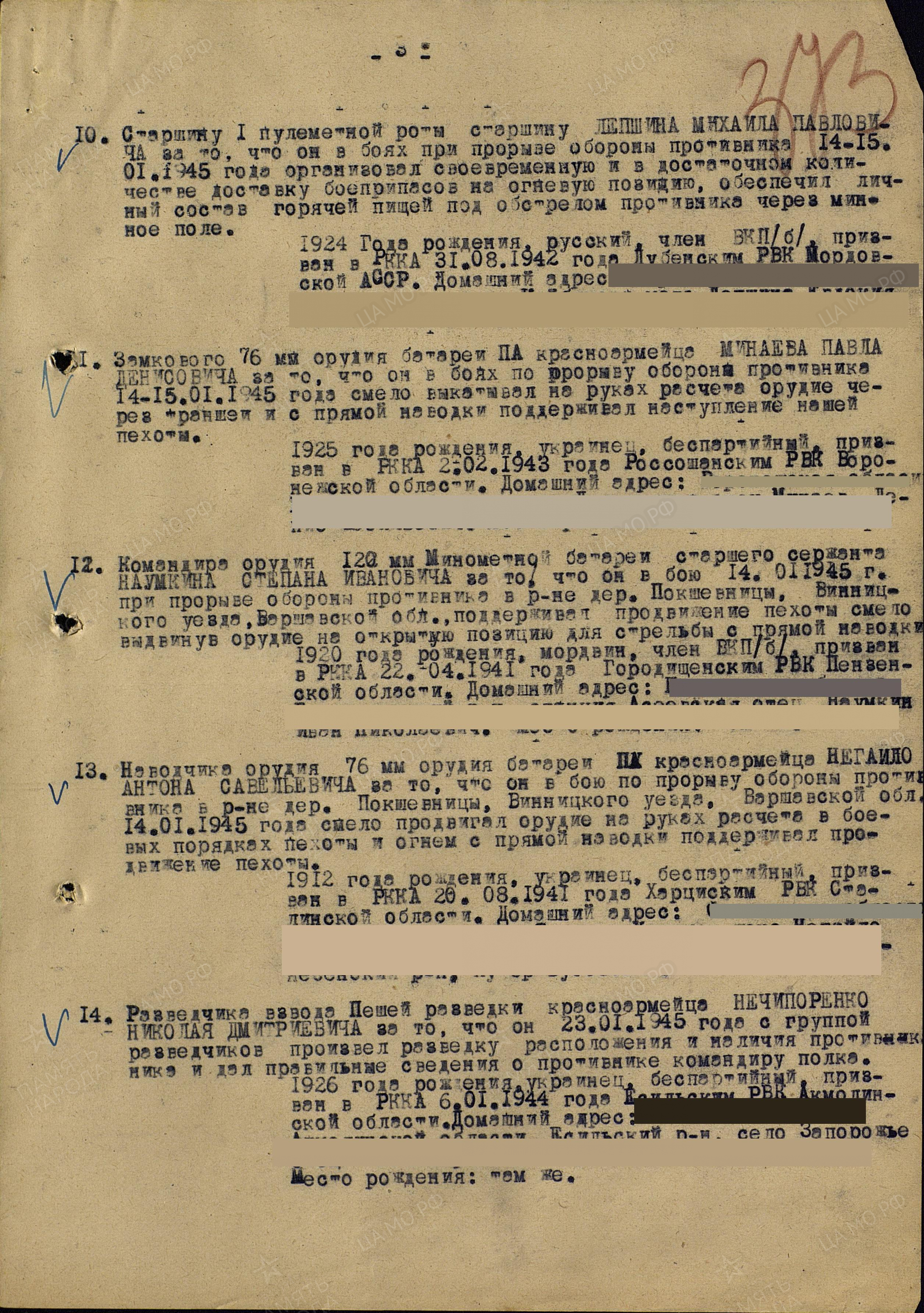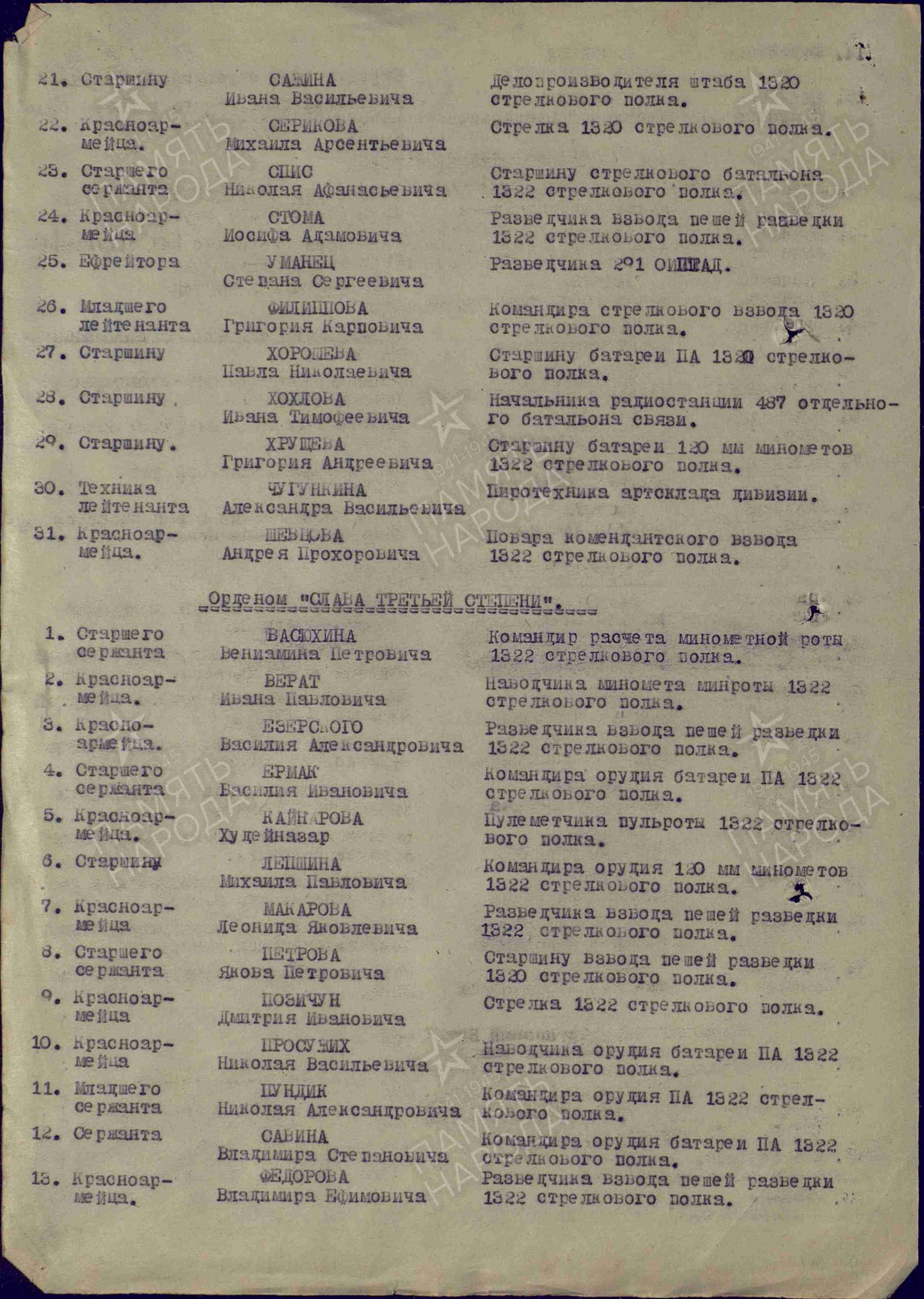 Из архива: «Наградной лист. Лепшин Михаил Павлович Краткое, конкретное изложение личного боевого подвига или заслуг. В боях при расширении плацдарма на правом береги реки Одер в р-не выс. 65.4 южн. г. Штеттин 22.04.45 г. при наступлении наших стрелковых подразделений он несмотря на сильный арт. Мин. огонь противника вел сильный огонь из своего орудия, при этом уничтожил одну противотанковую пушку вместе с расчетом. При наступлении 23.04.45 г. в р-не д. Хоэн-Цеден огнем своего миномета уничтожил 2 станковых пулемета. Достоин Правительственной награды ордена «Славы 3-й степени». Командир 1322 отр. Ордена Суворова 3 ст. полка Подполковник подпись Морозов»